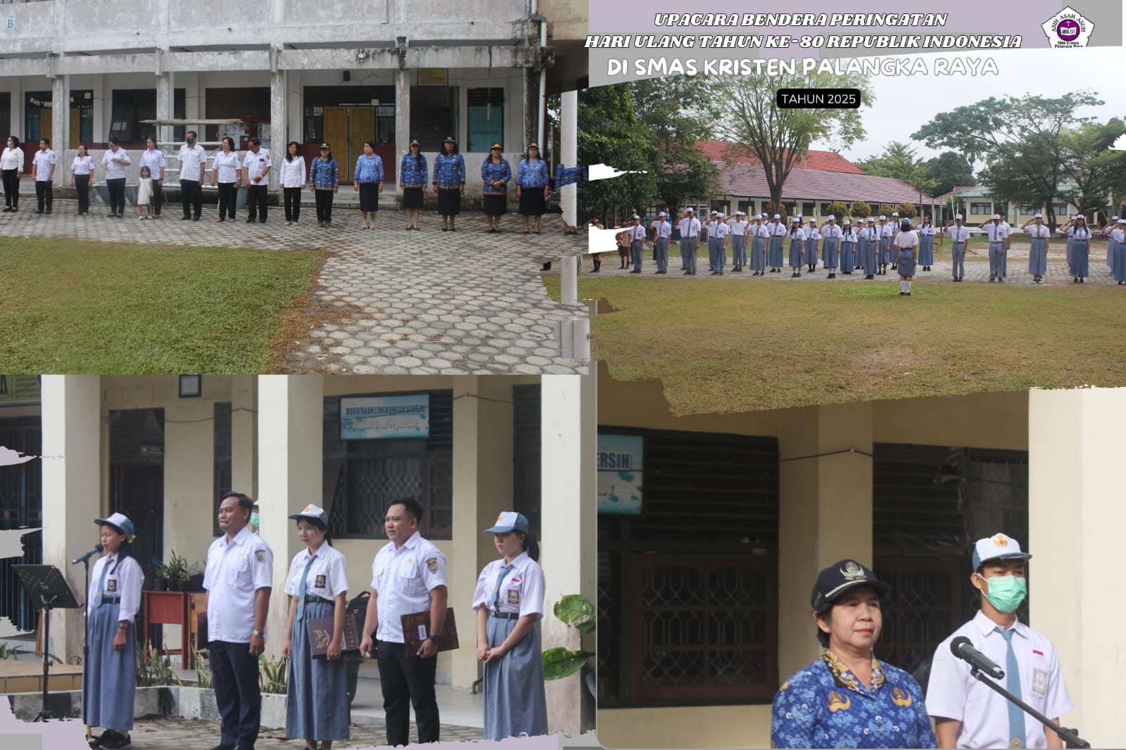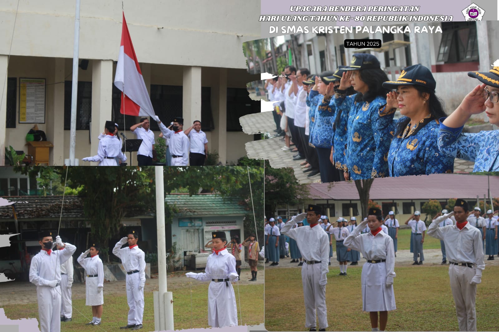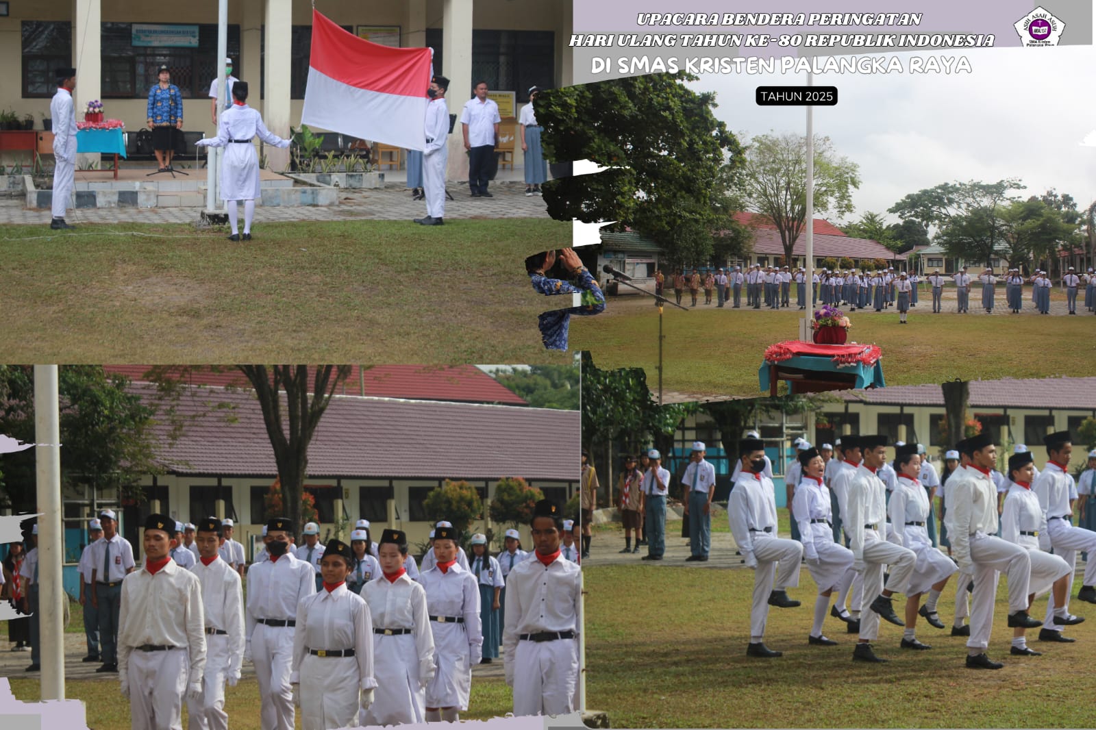 Pada hari Minggu, 17 Agustus 2025, SMA Kristen Palangka Raya melaksanakan upacara bendera dalam rangka memperingati Hari Ulang Tahun ke-80 Republik Indonesia. Kegiatan berlangsung khidmat dan lancar di halaman sekolah, dihadiri oleh Kepala Sekolah, Wakil Kepala Sekolah, seluruh dewan guru, tenaga administrasi, serta para murid dari berbagai tingkat.